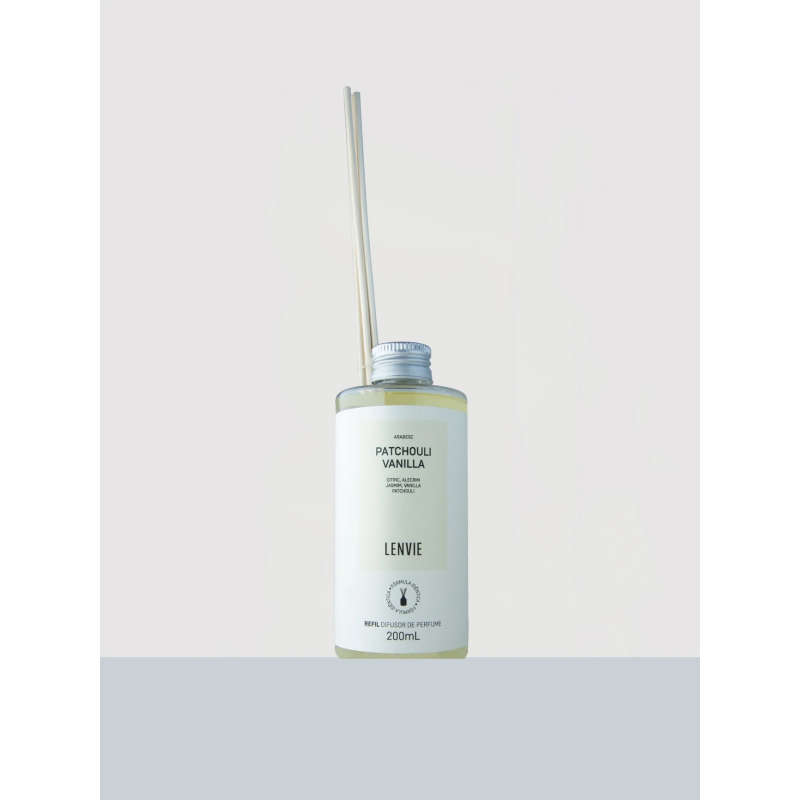 O Refil Difusor de Perfume Patchouli Vanilla 200ml, ideal para a reposição do líquido no frasco do difusor, sendo uma opção prática e sustentável.